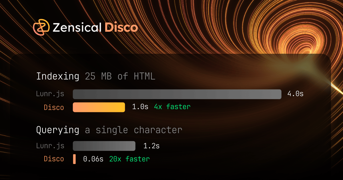 In 0.0.10, we made significant performance improvements to Disco, Zensical's search engine. Disco is now up to 20x faster than Lunr.js, used by Material for MkDocs, and delivers more relevant results, thanks to a new ranking algorithm. Startup time improved by a factor of four – search now feels snappier than ever! |